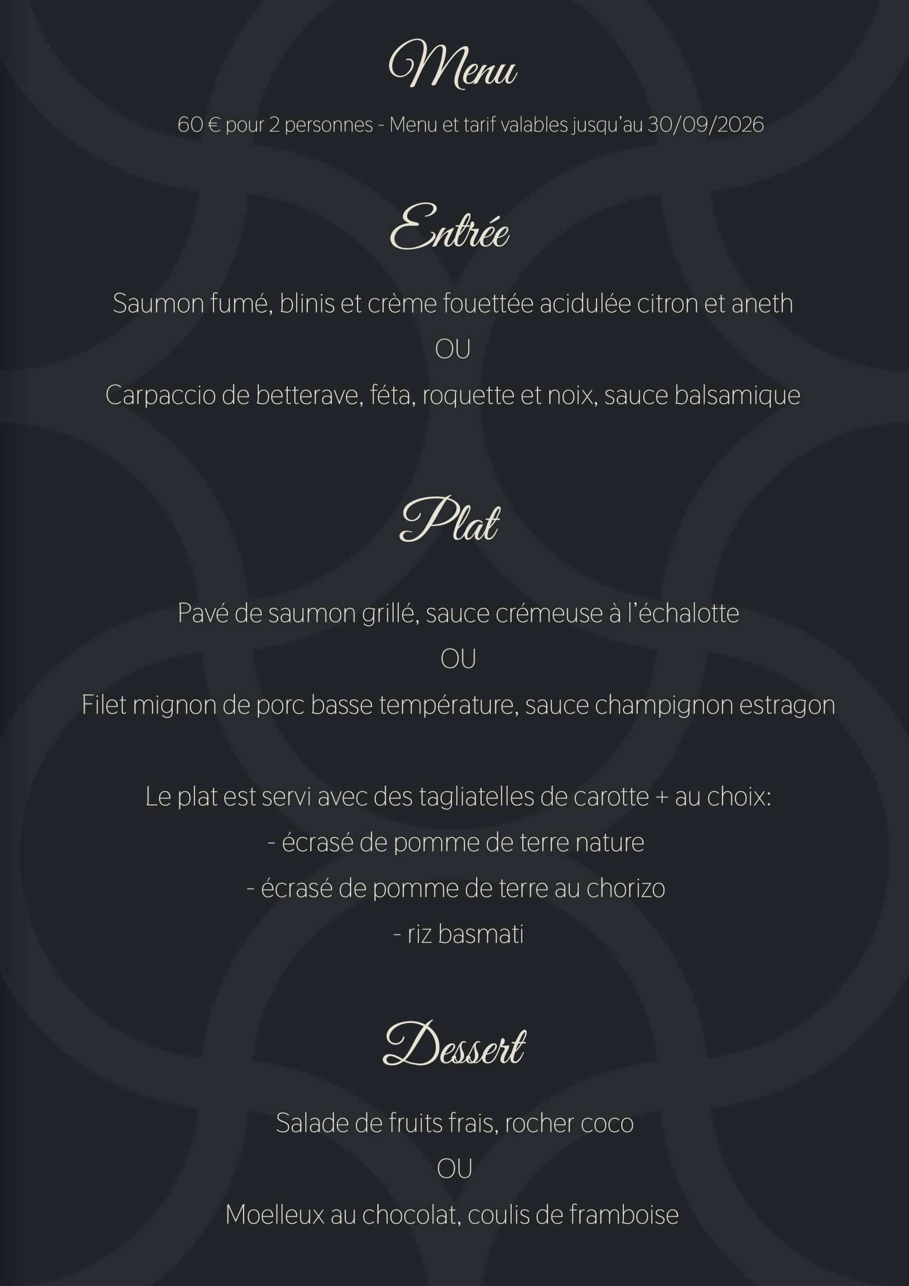 Vous êtes amateur de vin et/ou de champagne ? Nous aussi ! Nous avons sélectionné pour vous de quoi accompagner votre dîner. Vous aurez juste à cocher la case de votre breuvage préféré sur la page réservation.